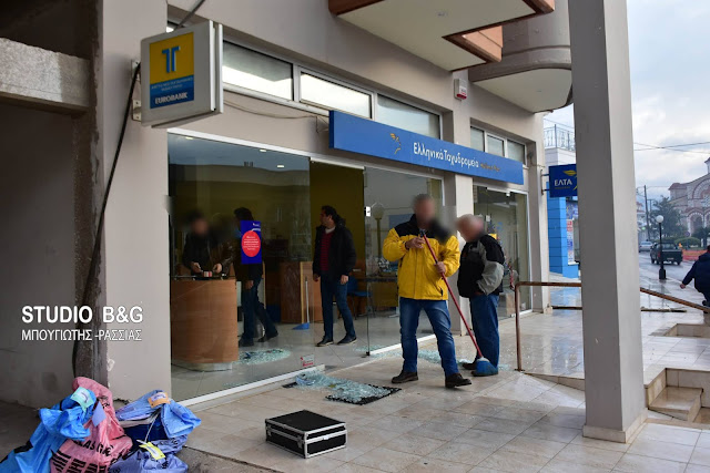 Οι άγνωστοι δράστες έσπασαν την γυάλινη κεντρική είσοδο του υποκαταστήματος και εισήλθαν στο εσωτερικό αναστατώνοντας τα γραφεία και τους εσωτερικούς χώρους.