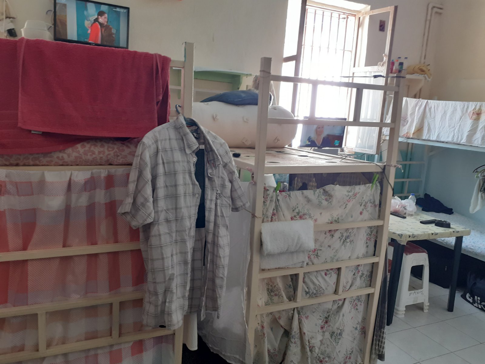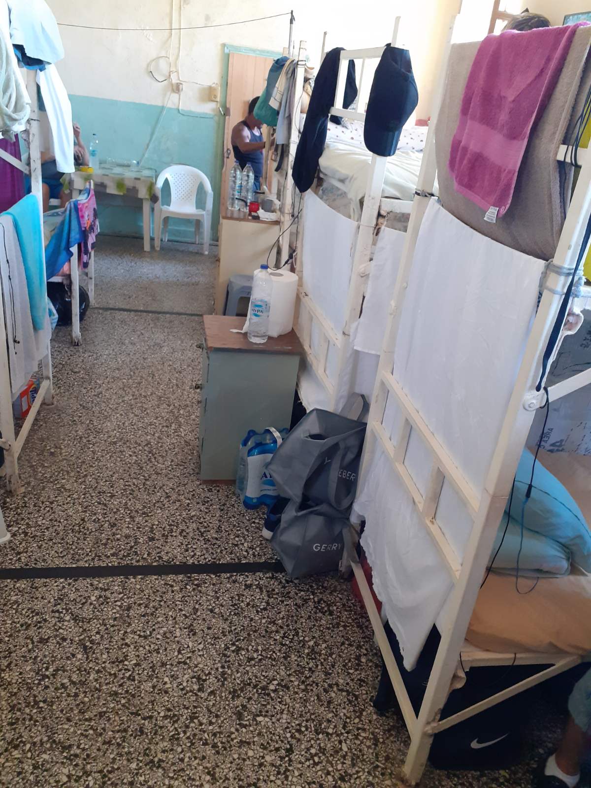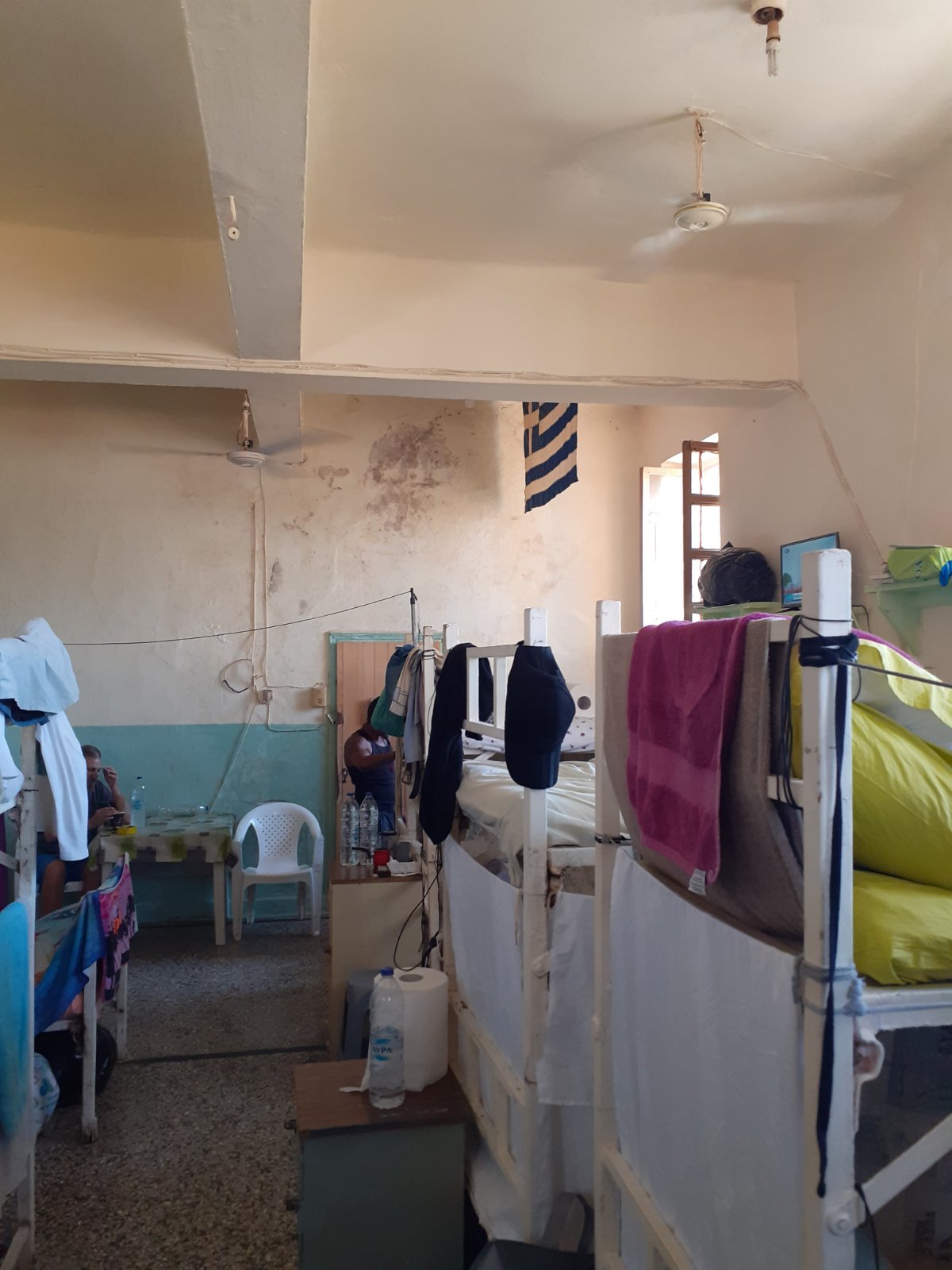 Επισκεφτήκαμε τα μαγειρεία, το χώρο του κλειστού και του «ανοιχτού» επισκεπτηρίου καθώς και έναν αποπνικτικό θάλαμο περίπου 40τμ στον οποίο υπήρχε το αδιαχώρητο, καθώς είναι στοιβαγμένα συνολικά 22 άτομα σε κουκέτες τη μία δίπλα στην άλλη αλλά και στον διάδρομο, με ελάχιστο ελεύθερο χώρο για να κινηθούν και ελάχιστο αέρα. Ένα πανί κρεμασμένο με μανταλάκια σε κάθε κουκέτα, εξασφαλίζει μια υποτιθέμενη ιδιωτικότητα.