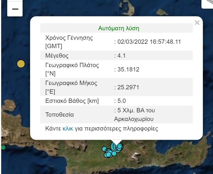 Σεισμική δόνηση μεγέθους 4,1 βαθμών της κλίμακας Ρίχτερ σημειώθηυκε λίγο πριν τις 19:00 το απόγευμα της Τετάρτης στο Αρκαλοχώρι.