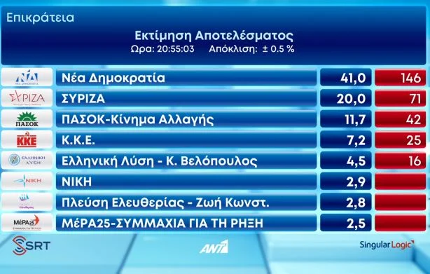 Καθαρή νίκη της ΝΔ, πεντακομματική Βουλή με το ΜέΡΑ25 να μένει εκτός κοινοβουλίου δείχνει η πρώτη επίσημη εκτίμηση για το τελικό αποτέλεσμα των εκλογών της 21ης Μαΐου 2023 του υπουργείου Εσωτερικών και της Singular Logic. Εκτός Βουλής μένει η ΝΙΚΗ και η Πλεύση Ελευθερίας.