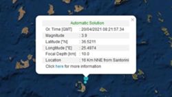 Σεισμική δόνηση μεγέθους 3,9 βαθμών της κλίμακας Ρίχτερ σημειώθηκε σε θαλάσσιο χώρο στη Σαντορίνη και συγκεκριμένα 16 χλμ. βόρεια-βορειοανατολικά του νησιού.
