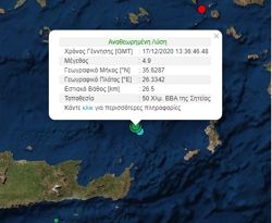 Σεισμός μεγέθους 4,9 βαθμών της κλίμακας Ρίχτερ σημειώθηκε το μεσημέρι της Πέμπτης (ώρα 13:36) σε θαλάσσιο χώρο βορειοανατολικά της Κρήτης.
